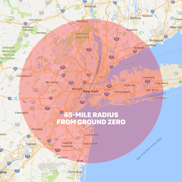 If we take the ground zero of the Twin Towers attack on 9/11 as a starting point, here’s what a 45-mile radius looks like in New York City:
